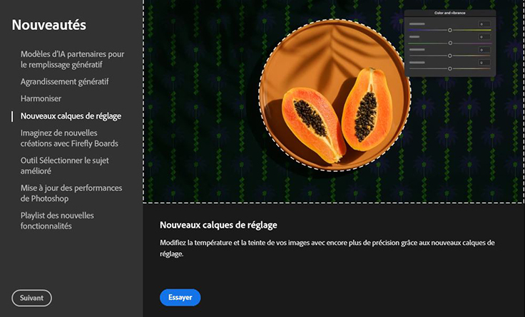 Le fameux Remplissage génératif s’enrichit : on peut désormais choisir le modèle d’IA selon le rendu qu’on veut obtenir. Résultat : moins d’essais, plus de précision. Et pour les montages photo ? Le nouvel outil Harmoniser ajuste lumière, couleur et contraste pour fondre naturellement un sujet dans son décor. Ajoute à ça un agrandissement génératif qui conserve les textures sans flouter l’upscaling devient enfin digne de ce nom.